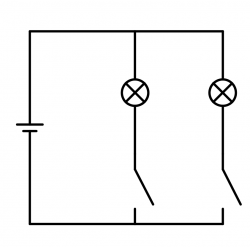 - Der Stromkreis wird von zwei Schaltern unterbrochen. Nur wenn der eine UND der andere Schalter geschlossen ist, leuchtet das Lämpchen.